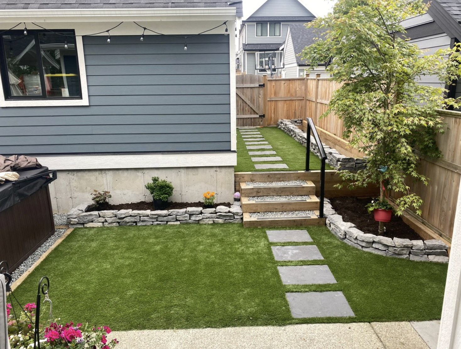 Contrast the previous example with this one. This project is half the area coming in at approx 600sqft (there is one other long thin piece installed that is not visible in this photo). Significant time was needed to cut in and level each stepping stone slab you see. This takes time as well as produces scrap grass waste. Similarly, the long thin pieces of grass must be cut from a 15ft stock width. In many cases, some or all of that excess width turns into scrap waste.