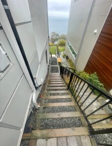 This project had the worst access imaginable (swipe to see). Luckily there was minimal excavation needed, and that which was we were able to dispose of in an area below that is going to be covered by a future deck. Still a few yards of turf soil and 50 rolls of sod were moved down the stairs to the job site. This total grass area of this installation is 425sqft (about 100sqft more than our previous example). Even though the grass area is larger, this installations budget came in $500 less than the previous example for two reasons. The first due to our ability to dispose of excavated material directly on-site. The second due to much less turf soil needing to be brought in to raise the level of the new lawn.